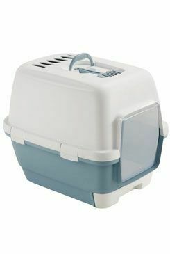 Krytá kočičí toaleta s filtrem a výsuvným dnem. Součástí balení je lopatka, uložená v horní části toalety.