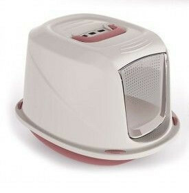 Krytá toaleta pro kočky s filtrem a madlem pro přenos. Pastelový odstín růžové barvy madla a vaničky v kombinaci se šedou barvou horní části WC.