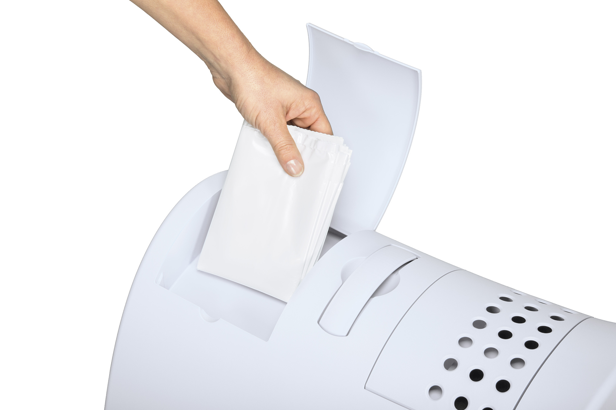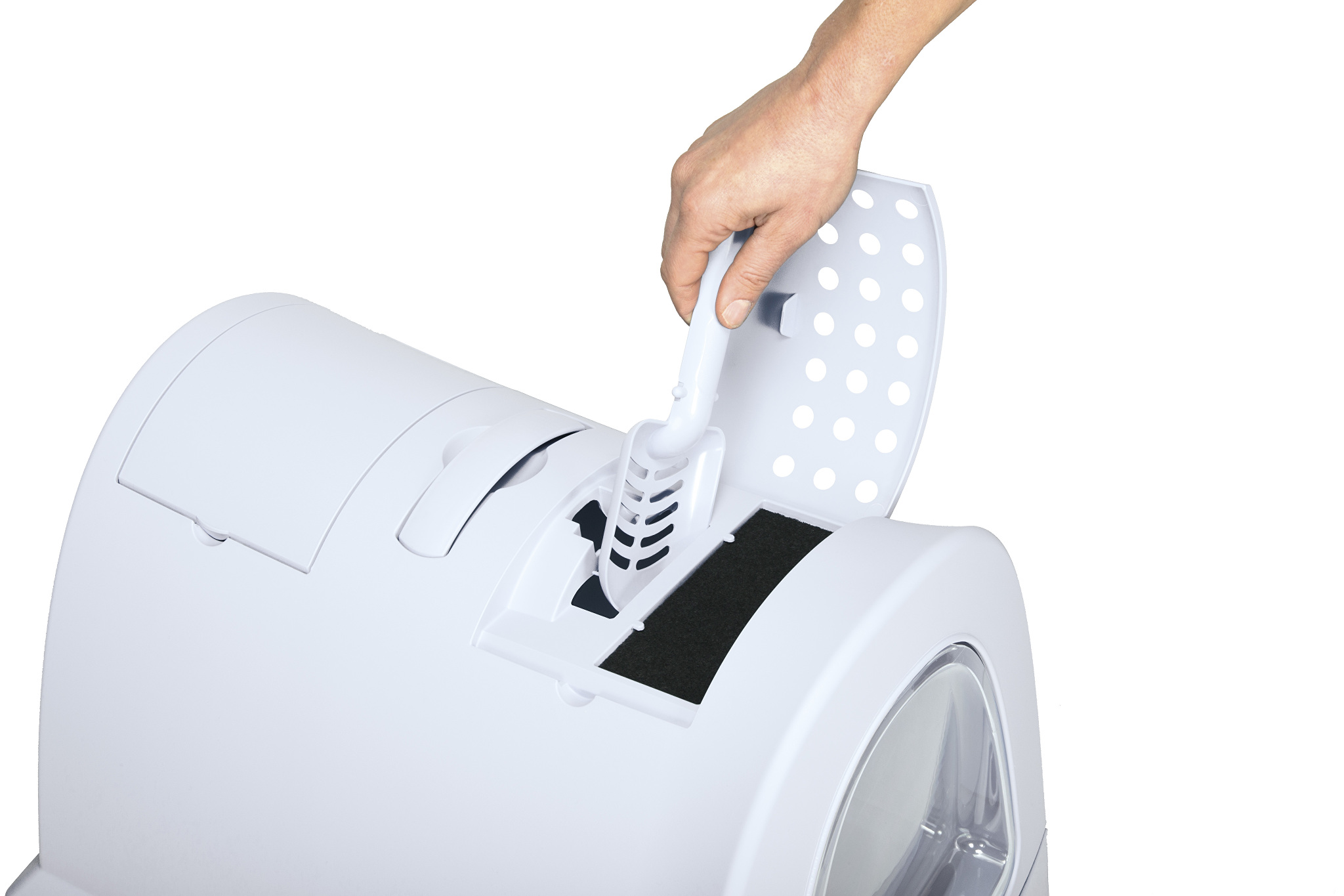 Toaleta mje vybavena lopatkou pro čištění ukrytou v horním uložném prostoru kde se nachází i druhá přihrádku na náhradní sáčky (sáčky nejsou součástí balení).
