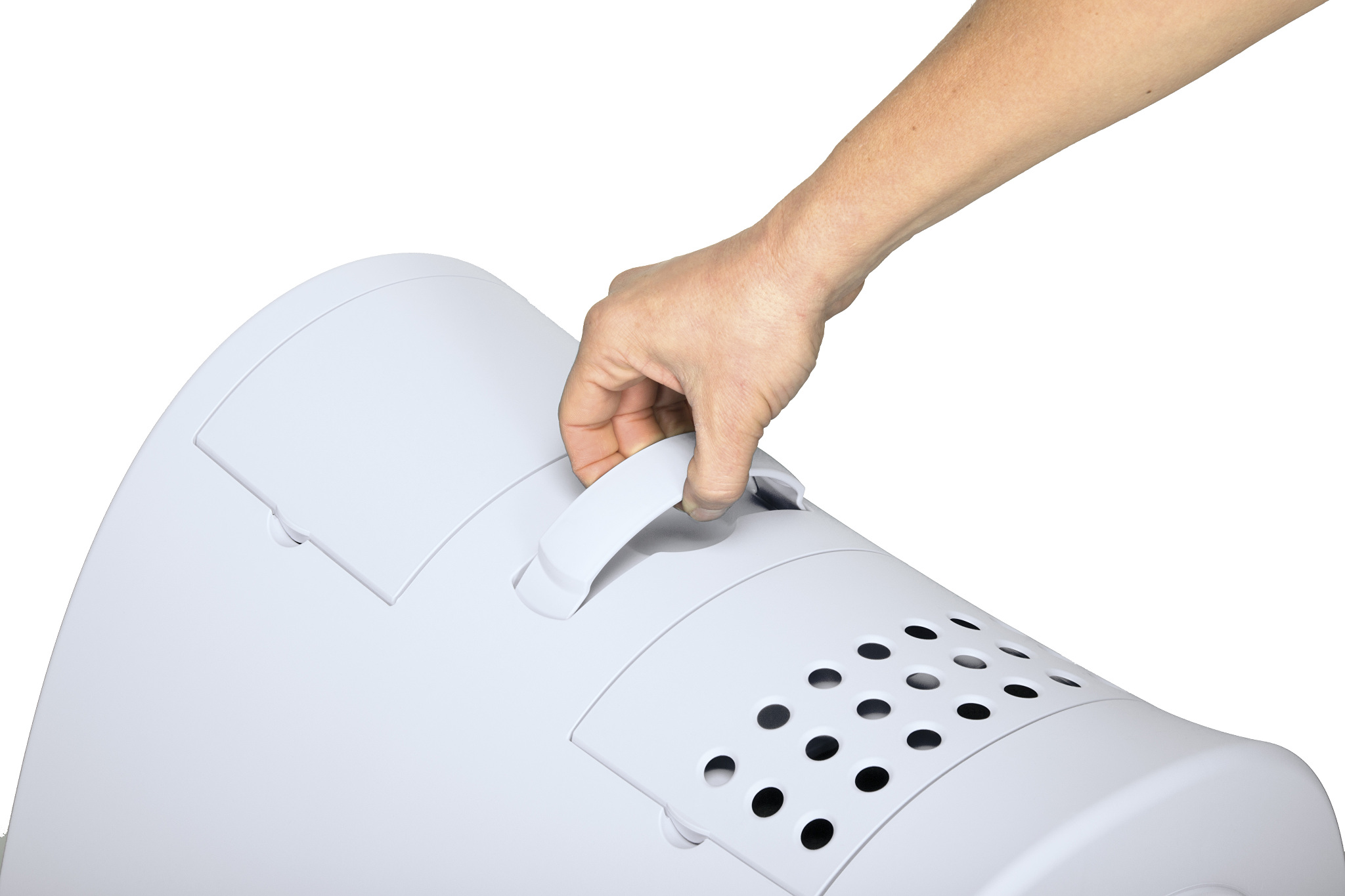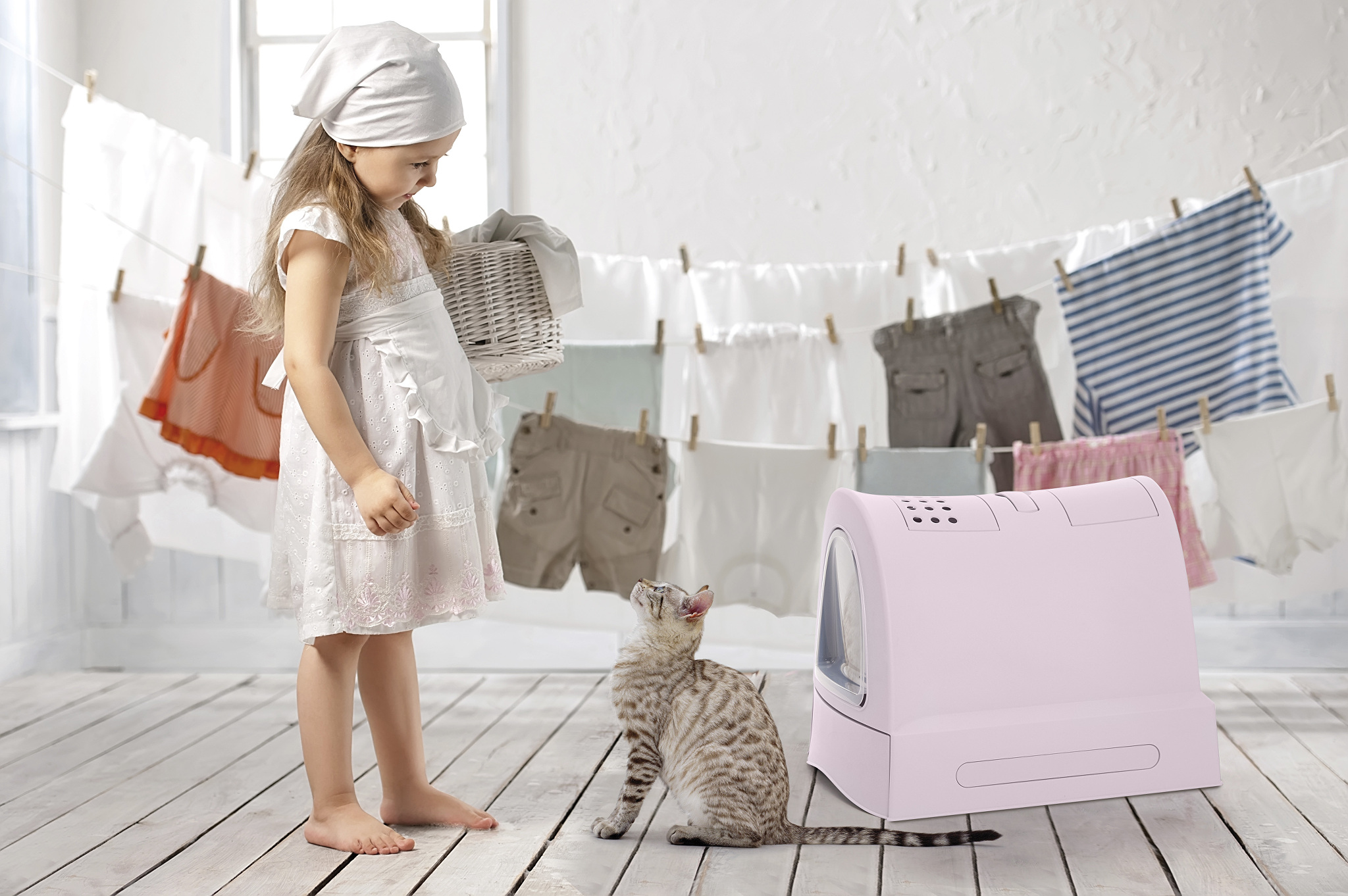 Krytá toaleta pro kočky s filtrem a madlem pro přenos.