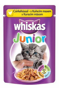 Whiskas kapsa Junior s drůbežím masem je vhodná pro rostoucí koťata do jednoho roku života, pro březí a dospělé kojící kočky. Whiskas Junior je pečlivě připraveno tak, aby kotě dostávalo lahodnou a výživnou stravu, díky které z něj vyroste silná a zdravá kočka. Velice chutná, šťavnatá a pro kočku lákavá strava dělá z tohoto krmiva opravdovou delikatesu, vhodnou pro každé mlsouny. Krmivo neobsahuje žádné umělé konzervační látky a barviva. Obsažené bílkoviny dodávají potřebnou energii naopak minerály podporují silný imunitní systém. Vápník je skvělý pro zdravé a silné kosti a zuby. Krmivo splňuje nutriční požadavky každého malého koťátka a příznivě rozvíjí kočičí organismus.