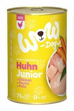 WOW Kuřecí s karotkou je kompletní mokré krmivo od předního rakouského výrobce vhodné pro štěňata a rostoucí psy všech plemen ve věku od 2 do 12 měsíců se 71% obsahem masa a vnitřností. Maso je doplněno zeleninou, bylinkami z Alp a vysoce kvalitním lněným olejem pro skvělý start do dlouhého života, pro zdravé kosti a klouby. Konzervy jsou ručně plněné v rodinné rakouské firmě z místních, většinou alpských, surovin ze zdravé přírody.